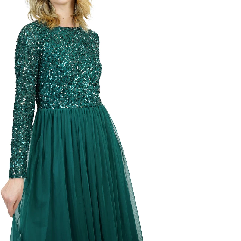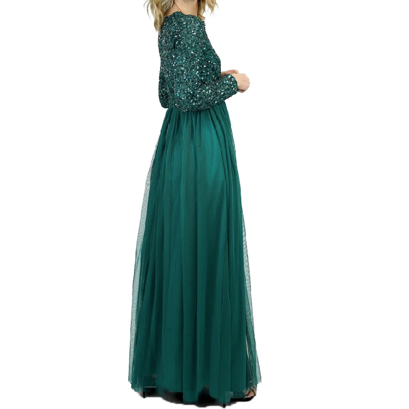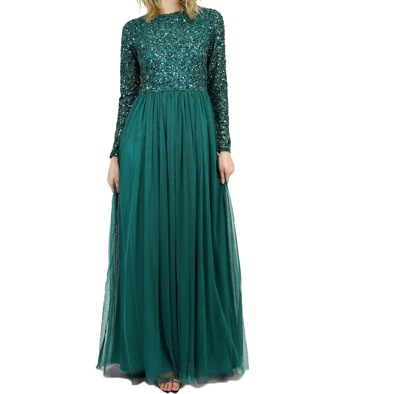 Custom Design Manufacturer Long Sleeve Sequin Top Tulle Skirt A-line Elegant Women Dresses for Wedding Guest